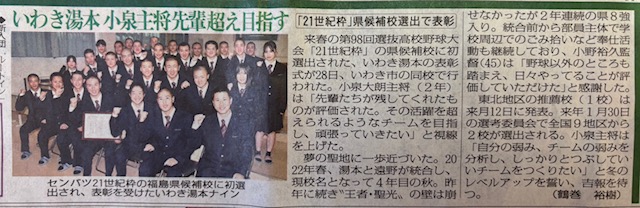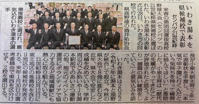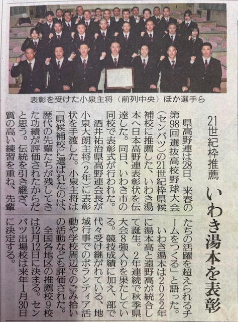 すでに報道等で承知の事とは思いますが、母校野球部が来春の第98回選抜高校野球大会(センバツ)の21世紀枠県候補校に推薦をされ、先日、福島県高野連より「日本高野連表彰状」贈呈されました。今回の選考は、現役チームの活動はもちろんの事、歴代の会員皆さまの高校野球時代の活躍や活動が積み重なり、基となっていることは言うまでもありません。現役チームの皆さんには、更に日々の活動に尽力し、心身ともに精進をして欲しいと思います。また、本会員の皆さまにおかれましては、長年の夢でもあった甲子園出場が、このような形ではありますが、目の前にある事を実感して、皆さんと共に吉報を待ちたいと思います。